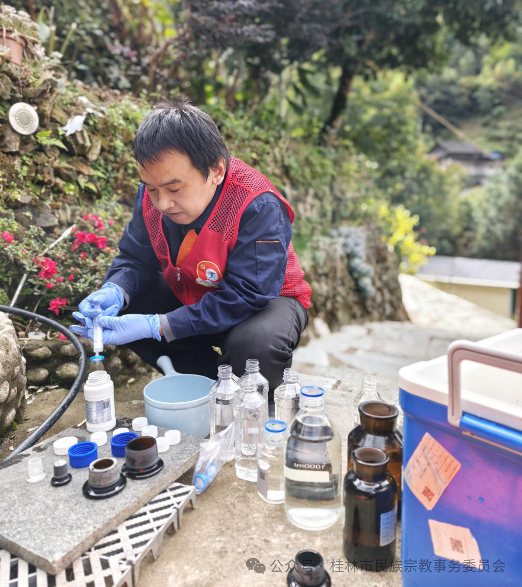 饮水安全是民生底线,更是民族团结的基础保障。活动组聚焦村民最关心的饮水安全问题,深入中洞村村民家中及饮用水水源地现场,开展“上门式”水质监测服务。技术人员携带便携式快速监测设备,严格按照监测技术规范完成水样采集、指标检测、数据分析等全流程操作,精准研判水质达标状况。同时,结合检测结果向村民面对面讲解水源地保护范围、日常水质维护技巧,现场解答“水质如何判断”“怎样净化饮用水”等疑问。这一精准服务并非偶然,十年帮扶期间,桂林中心充分发挥生态监测专业优势,已多次开展乡村饮用水安全专项帮扶,更主动捐赠一套小型水质自动监测设备,助力村里构建“日常监测+专业巡检”的饮水安全保障体系,让各族群众长期稳定享有安全饮水福祉,切实增强获得感、幸福感、安全感。