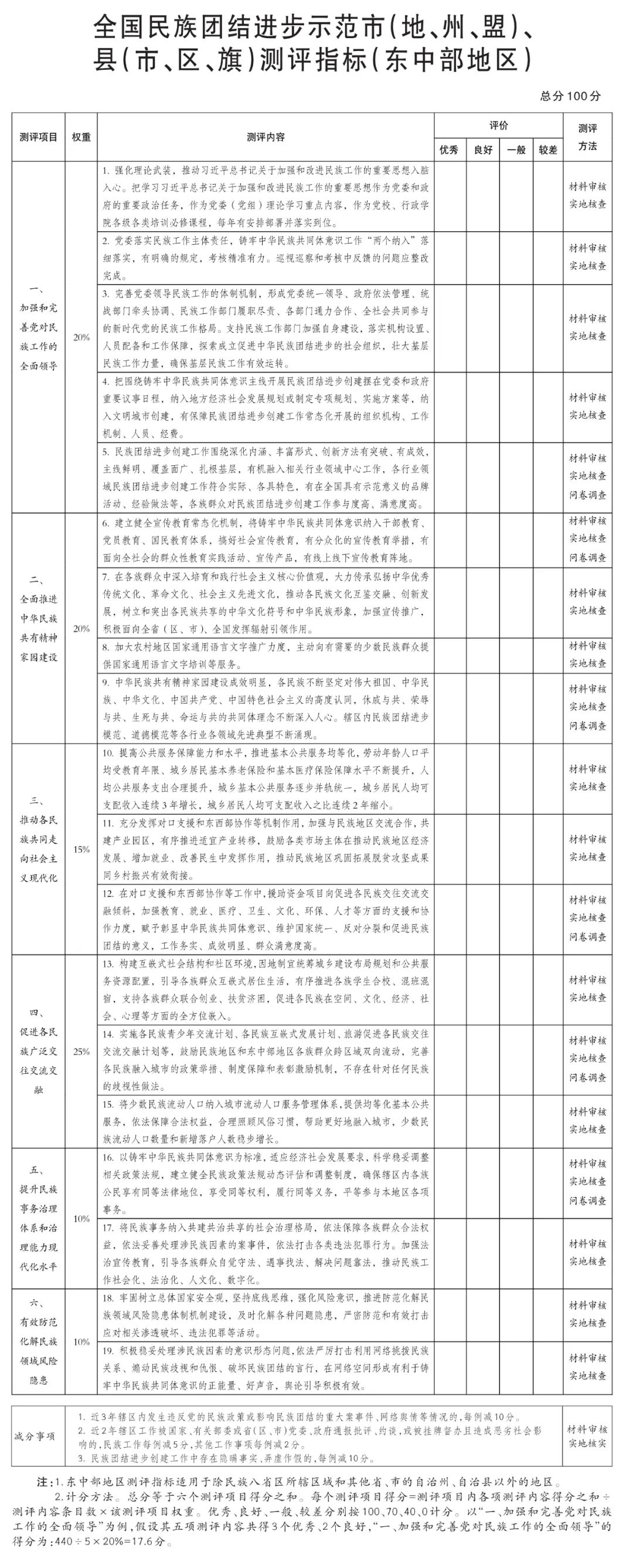 全国民族团结进步示范市(地、州、盟)、县(市、区、旗)测评指标印发