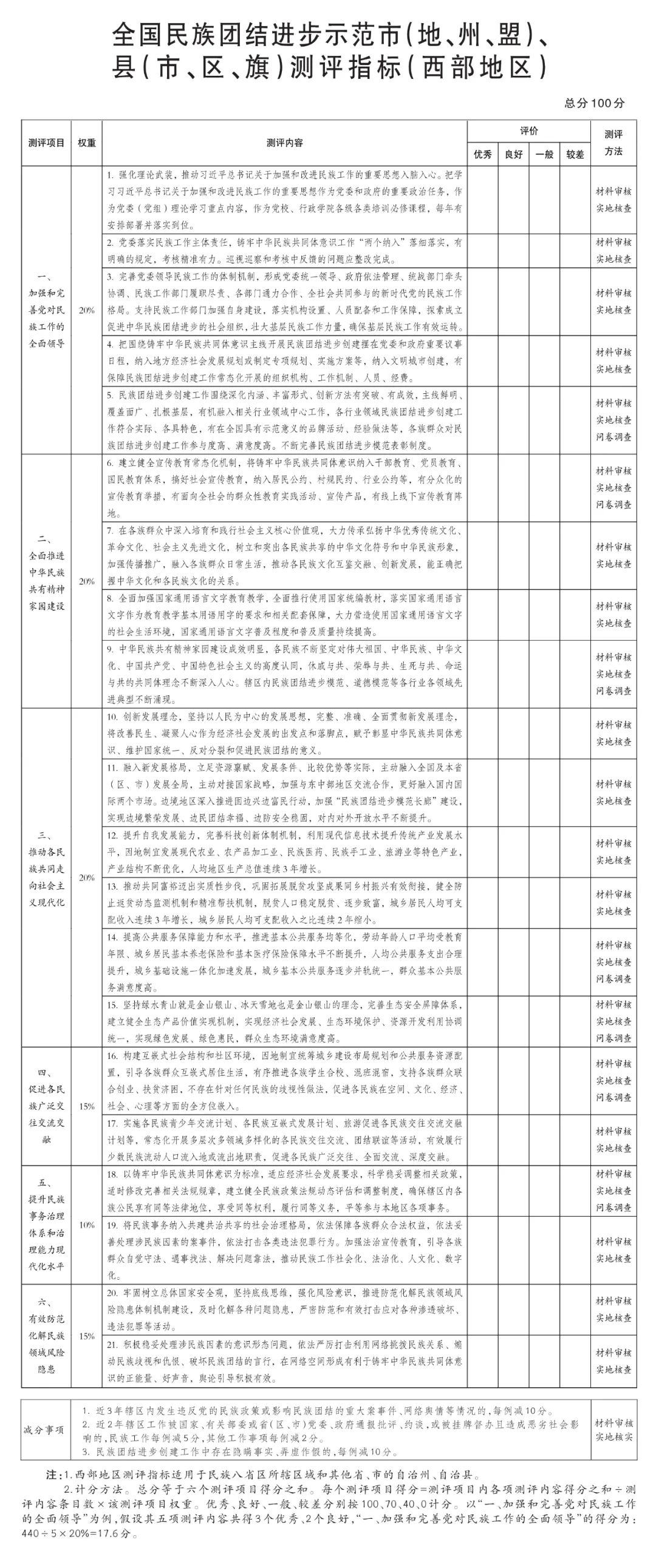 为完整准确全面贯彻习近平总书记关于加强和改进民族工作的重要思想,深入落实中央民族工作会议精神,引导和推动各地以铸牢中华民族共同体意识为主线,深入开展民族团结进步创建,着力深化内涵、丰富形式、创新方法,打造创建工作“升级版”,经认真研究,并报中央领导同志同意,国家民委对《全国民族团结进步示范州(地、市、盟)测评指标(试行)》(民办发〔2020〕4号印发)和《全国民族团结进步创建活动示范县(市、区、旗)测评指标》(民委发〔2014〕94号印发)进行了修订完善。新的测评指标更加突出铸牢中华民族共同体意识这条主线,突出对西部地区、东中部地区进行分类考核,突出考核工作实效。测评指标总分100分,省(区、市)测评得分90分以上可向国家民委申报,国家民委按程序进行综合评分,达到90分以上可作为全国示范。