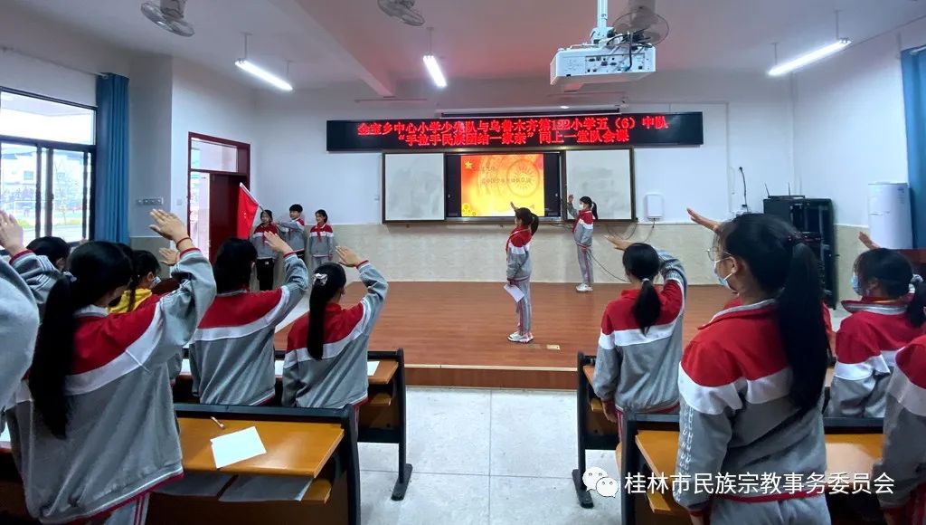 为培养少先队员的爱党爱国情怀,弘扬民族传统文化,铸牢中华民族共同体意识,近日,阳朔县阳朔镇凤鸣小学、金宝乡中心小学少先队员分别与乌鲁木齐市第122小学少先队员以互联网连线的方式,开展“同上一堂课同唱一首歌”主题云队课。