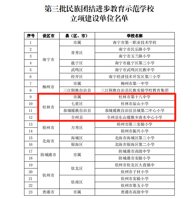 日前,自治区教育厅公布第三批民族团结进步教育示范学校立项建设单位名单。我市第十八中学、桂林市辰山小学 、恭城瑶族自治县县城第二中心小学 、全州县东山瑶族乡清水中心小学4所学校入选。据统计,我市民族团结进步教育示范学校立项建设单位数量在全区排名第三。