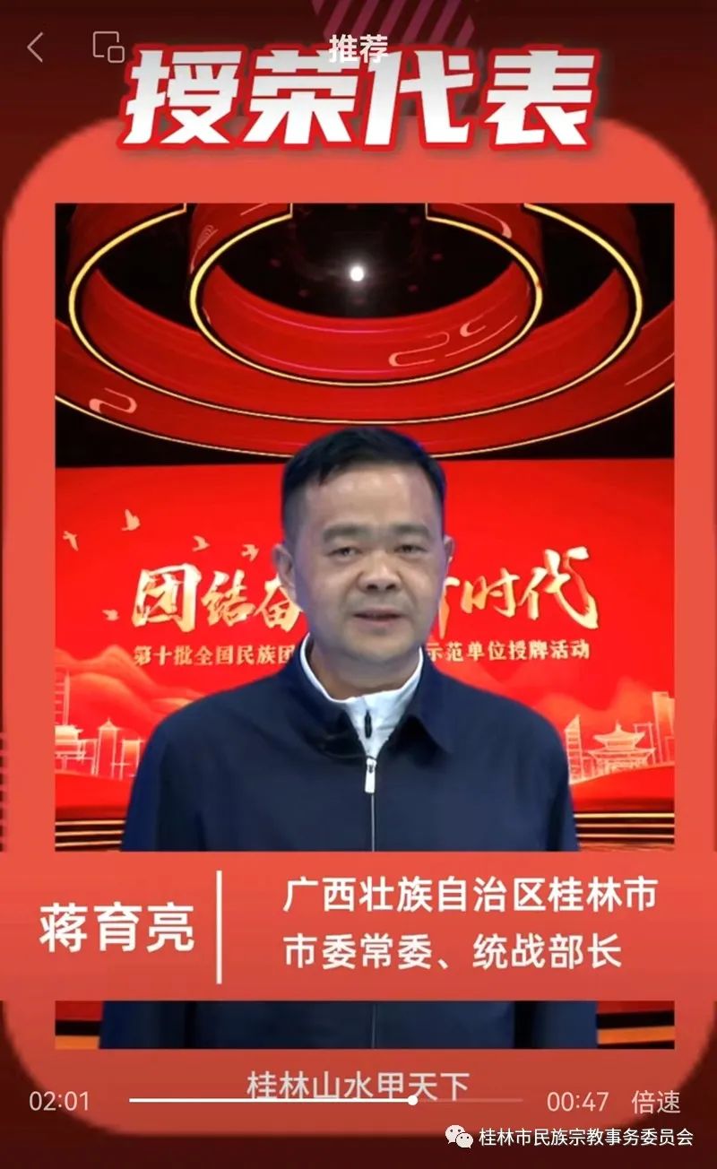 桂林市崇善清真寺管委会主任阿訇阮金宽表示:观看了授牌活动,心潮澎湃、备受鼓舞,我因生活在如此强大的祖国感到自豪和幸福,我们今年申报创建全国民族团结进步示范单位更有信心、更有干劲、更有举措了。我们将以习近平新时代中国特色社会主义思想为指引,牢牢抓住铸牢中华民族共同体意识这条主线,开展好民族团结进步创建工作,与各族群众团结奋进,谱写新时代民族团结进步事业的新篇章!