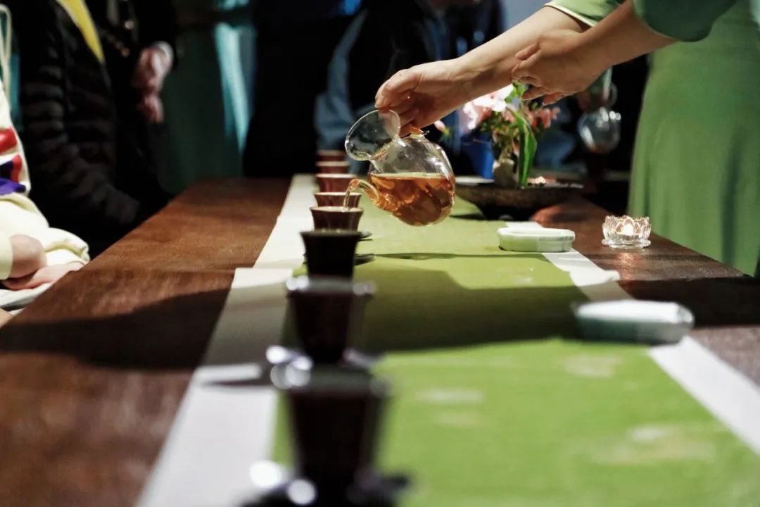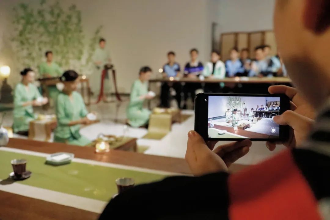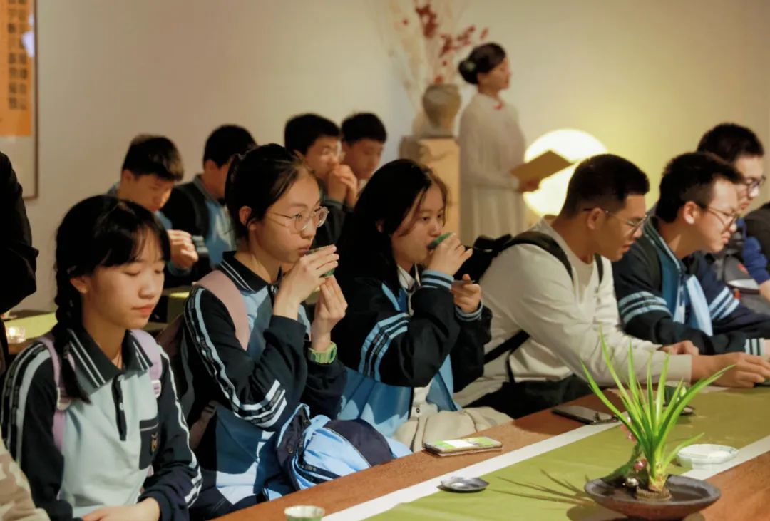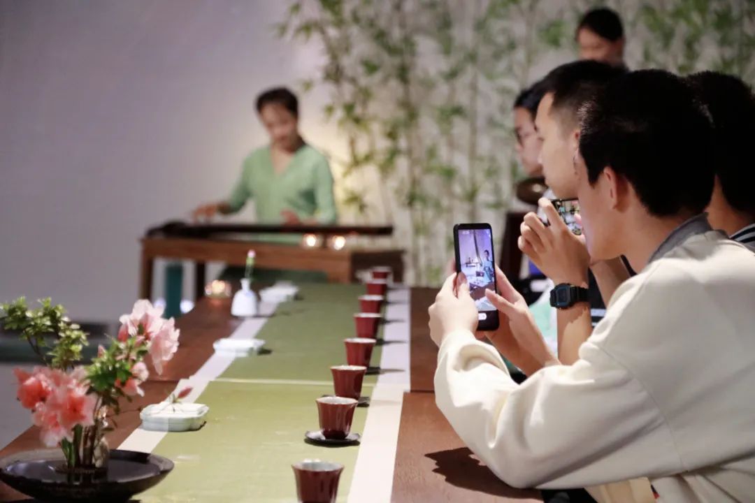 视听盛宴过后,师生们落座生活美学体验「西山雅集」,在桂林圆竹剖丝团扇、桂林剪纸、桂林漆器等非遗成果环绕的展厅里,赏香花,观香篆,品香茗,涤荡肺腑心神。