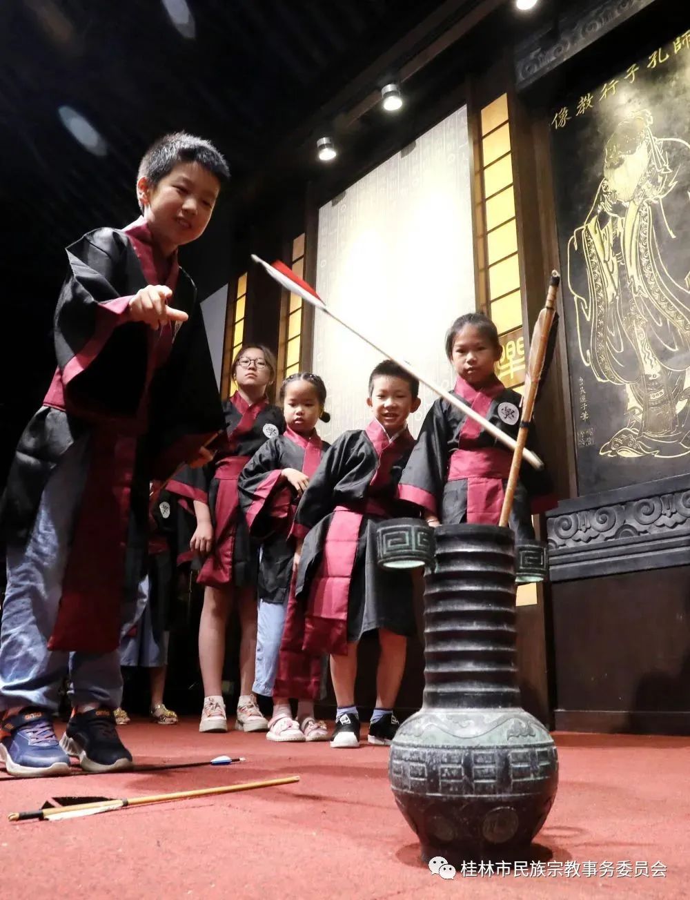 身着古装的小朋友在苏州碑刻博物馆体验投壶游戏。新华社发