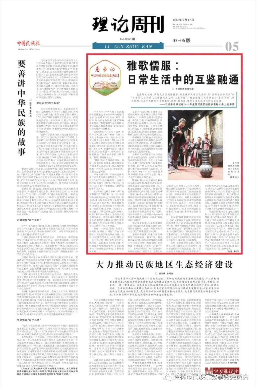 我国各民族的交往交流交融是全方位的,诚如有些学者所提出的那样,中华民族从自在到自觉,是一个漫长的历史过程,要理解这个过程,就不能简单地只靠文献记载的“历史事实”,还要从具体的民间日常生活中去寻找答案。理解各民族之间的关系也是如此,除了文字记载的“大事”外,民族关系更多地体现在老百姓日常的生产生活中,体现在“雅歌儒服”这样的风俗习惯中。“九层之台,起于累土。”正是这无处不在的交往交流交融,推动中华民族生生不息、发展壮大。(执笔:海宁)