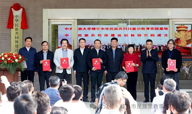 仪式上,覃汉华与蒙曼共同为中央民族大学铸牢中华民族共同体意识教育实践基地揭牌,石亚洲与钟勇军共同为中华民族共同体建设桂林研究院揭牌。并为蒙曼和田联刚、中央民族大学美术学院院长乌日切夫、中国人民大学文化产业研究院院长曾繁文、浙江大学建筑设计研究院总建筑师董丹申5位专家颁发桂林铸牢中华民族共同体意识特聘专家聘书。