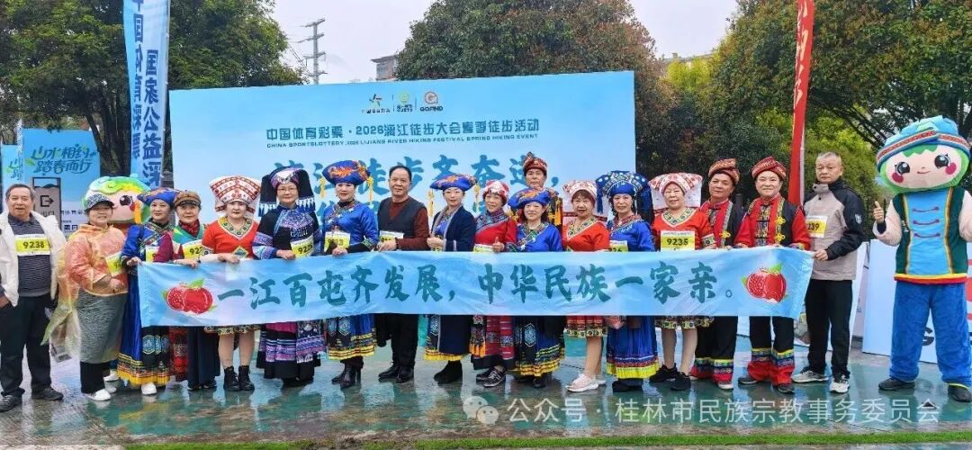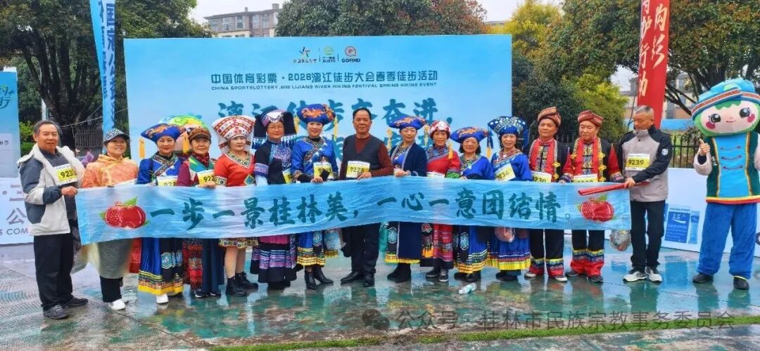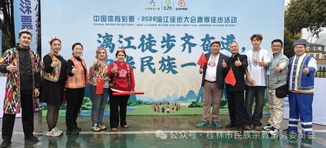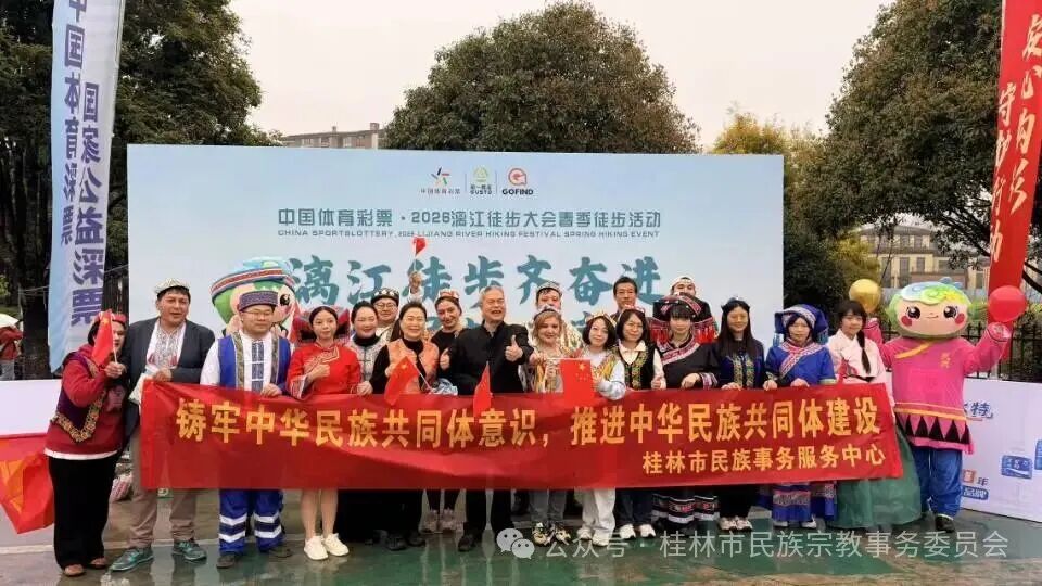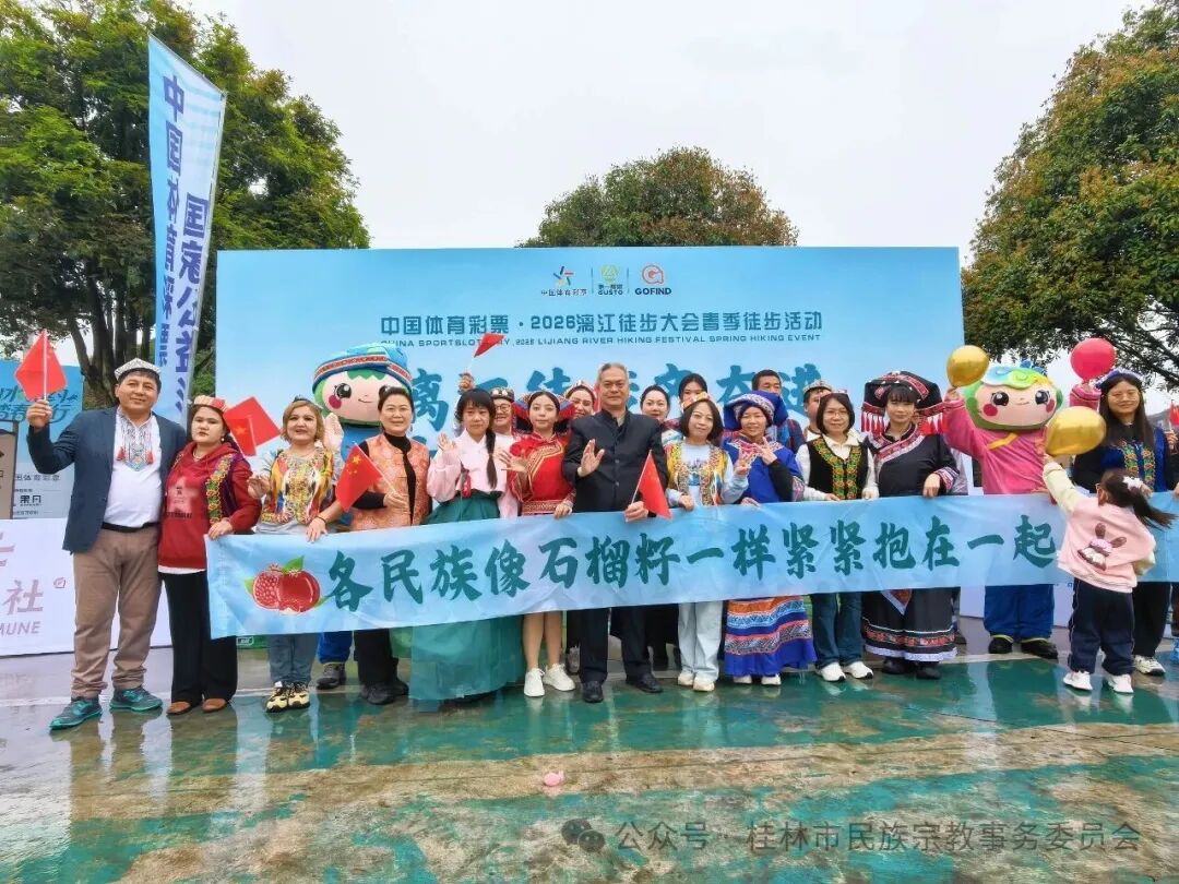 漓江徒步齐迈步,中华民族一家亲。3月22日,2026年漓江徒步大会春季徒步活动在桂林桃花江畔圆满举办。本次活动由桂林市体育局、市民族宗教事务委员会、市商务局、市文化广电和旅游局、桂林市秀峰区人民政府联合主办。设休闲组(5公里)与毅行组(11公里)两条路线,融合运动、旅游、美食、非遗等元素,吸引了来自摩洛哥、中国香港以及广东、贵州、湖南、新疆等28个省市、157个地级市、422个县区的18793名徒步爱好者参与。