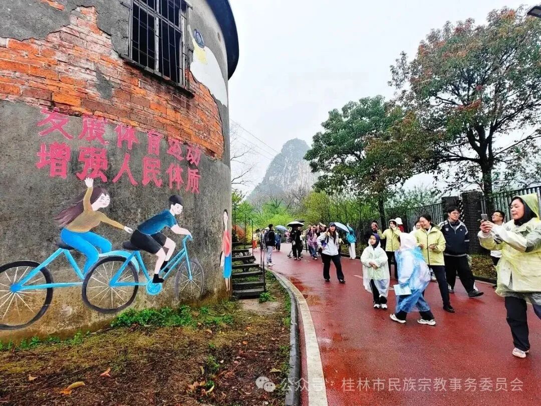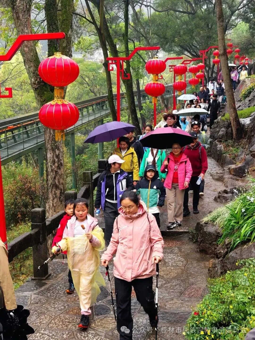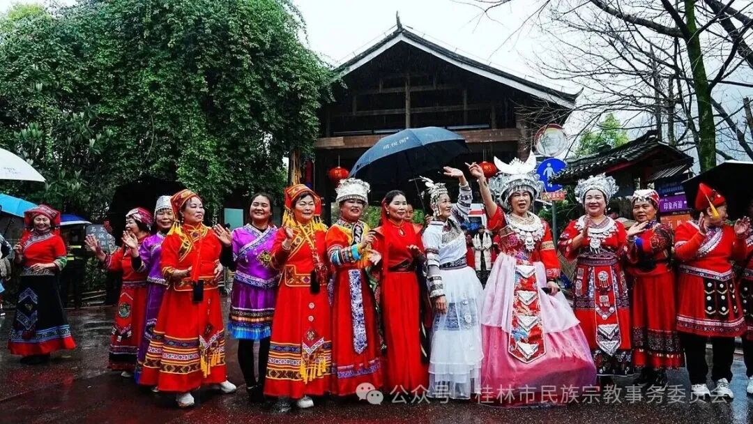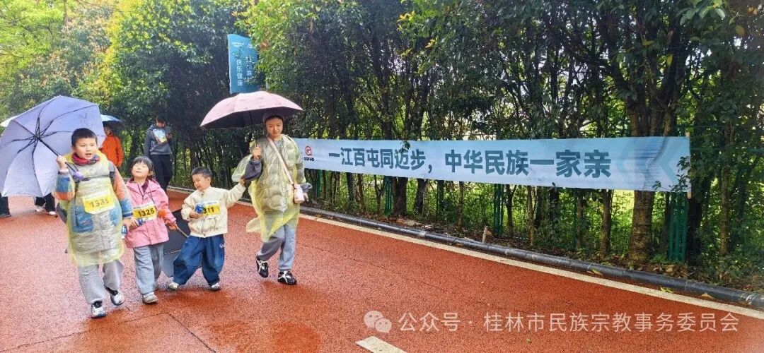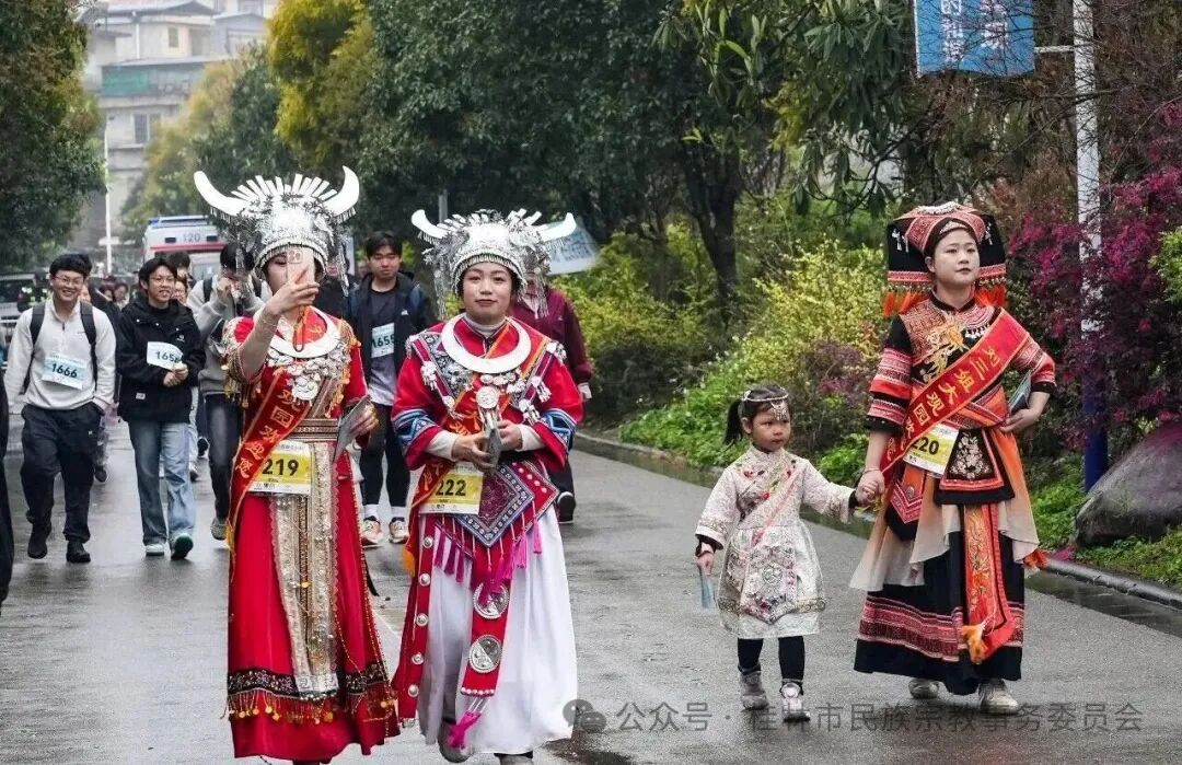 徒步活动中,来自各基层社区的56名各族群众组成的“民族团结进步徒步方阵”成为最具特色的风景线。虽然民族不同,籍贯各异,但大家都身着盛装、携手同行,在春雨中生动诠释了“各民族像石榴籽一样紧紧抱在一起”的深刻内涵,让民族团结之花在烟雨漓江间绚丽绽放。