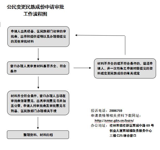 申请材料目录详见附件2-2、申请表空表(Word格式)、示范文本(jpg格式)。 一、未满十八周岁公民申请变更民族成份,需提交以下证明材料(原件及复印件3份): (一)书面申请书。根据生父(母)的民族成份提出变更申请的,书面申请书应当由直接抚养的一方签署;根据养父(母)的民族成份提出变更申请的,书面申请书应当由公民养父母共同签署;根据继父(母)的民族成份提出变更申请的,书面申请书应当由与公民共同生活的生父(母)与继母(父)共同签署。申请之日公民已年满十六周岁的,申请人应当征求公民本人的意见。 (二)公民本人的居民户口簿及公民的养(继)父(母)的居民户口簿、居民身份证; (三)依据生父(母)的民族成份申请变更的,需提供离婚证明;依据继父(母)的民族成份申请变更的,需提供生父(母)与继母(父)的婚姻关系证明;依据养父(母)的民族成份申请变更的,需提供收养证明。 (四)如居民户口簿不能体现父母子女关系的,需提供公民户籍所在地的乡(镇)人民政府、街道办事处出具的父母子女关系证明。 二、年满十八周岁的公民申请变更民族成份,需提交以下证明材料(原件及复印件3份): (一)由本人提交的书面申请书; (二)公民本人及其父母的居民户口簿、居民身份证; (三)如居民户口簿不能体现公民与父母子女关系的,需要提供公民户籍所在地的乡(镇)人民政府、街道办事处出具的父母子女关系证明。 | |